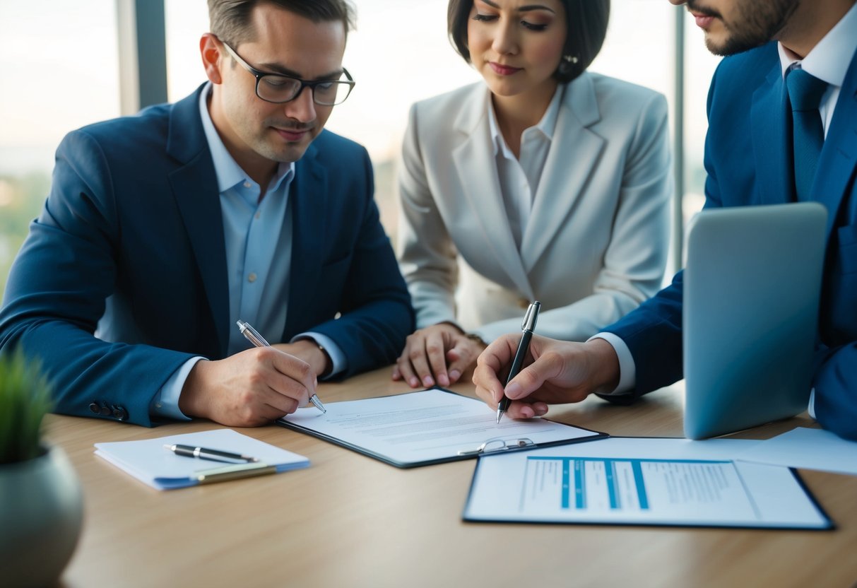 A person signing a document as a creditor looks on, while another person presents a formal proposal to manage their debts